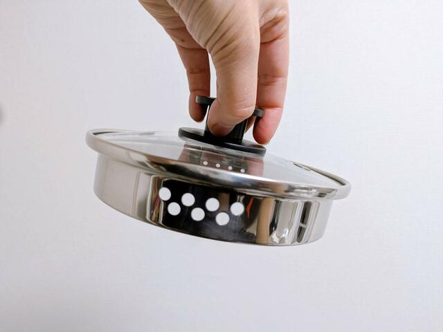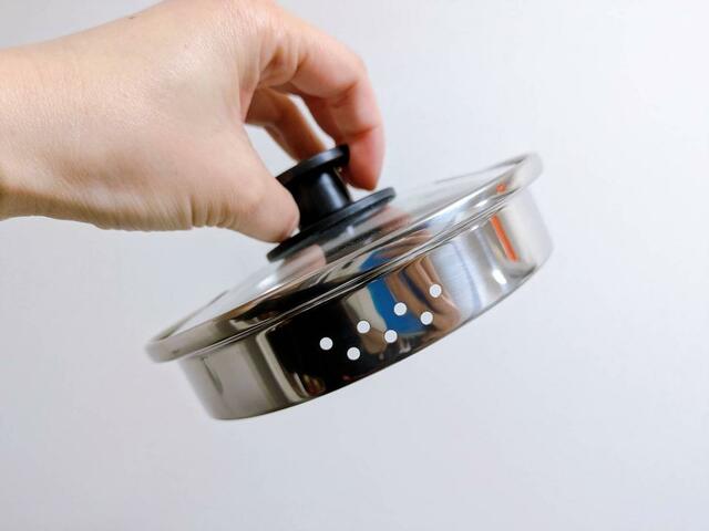 フタに大小2種類の穴が開いていて、調理している具材の大きさに合わせて使えるようになっています。