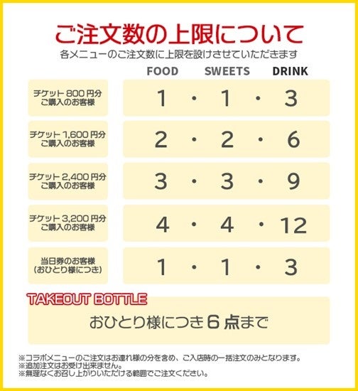 ※ご予約時間(入店時間)から30分過ぎてもご来店がない場合はキャンセル扱いとなり、ご入店いただけません。お食事クーポンの利用、グッズのご購入もお受けできかねますのであらかじめご了承ください。また、当日席へのご案内可能時間に関しましても各回の入店時間から30分後までとなります。