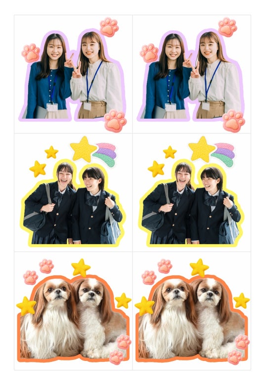 またiPhone(iOS)限定で、「背景除去」機能を搭載。写真から人物や動物などの被写体を残して背景を消すことができるようになりました。背景除去した対象物の輪郭に好みの色や太さの枠線をつける縁どりも可能です。思い出の写真、愛しいペット、お気に入りの物などを写真から切り取って、文字やデコアイテムで装飾もできるので、お手持ちの写真からオリジナルのフレークシールをつくることができます。