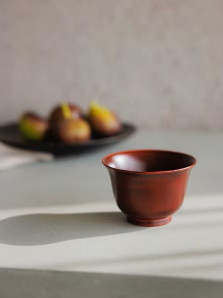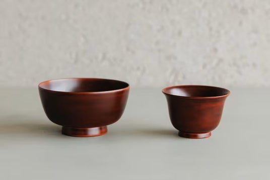 二つめは「端反壺椀(はぞりつぼわん)」。優しい口当たりになるように外に向かって反った上縁、そこから高台(こうだい)へ続くなめらかな曲線が美しいお椀です。 しっとりとやわらかな質感が心地よく、小ぶりで手に馴染みます。小さな汁椀として、湯呑みや日本酒のぐい呑みとして、また副菜の盛り付けになど、幅広くご愛用いただけます。