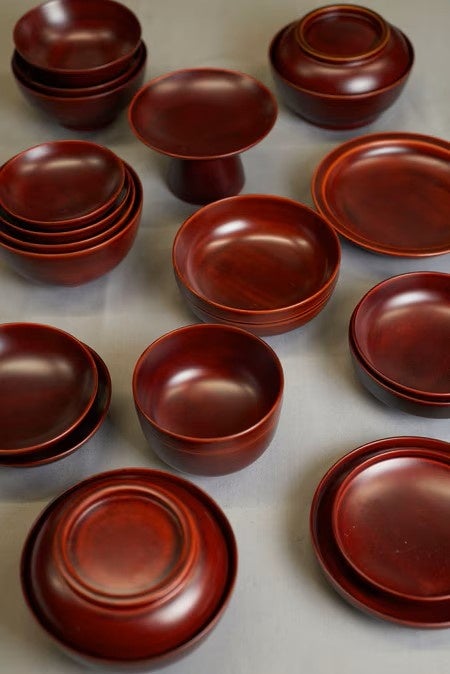 輪島の家庭では、冠婚葬祭などで使用する「御膳揃(ごぜんぞろい)」と呼ばれる蓋付きのお椀5~7点と、御膳が1組になった器のセットを、各家庭で20~40組、大きなお屋敷などでは80組以上が代々受け継がれてきたのだそうです。しかし能登半島地震の影響で、その大切な「御膳揃」を手放さざるを得なかったご家庭も少なくありません。そんな行き場を失った「御膳揃」を譲り受け、「能登の食や伝統を未来へつなぐプロジェクト」の一環として、「輪島キリモト」が器の再生に取り組んでいます。またこのプロジェクトを通して、輪島キリモトの工房以外の輪島市内の下地、研ぎ物、上塗りの職人さん達へも、定期的に仕事を依頼し続けることが可能になっています。