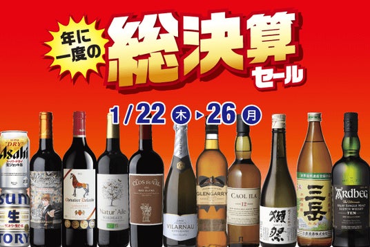 全国に202店舗で酒の専門店をチェーン展開する株式会社リカーマウンテンは、1月22日(木)~26日(月)の7日間、深夜営業店舗などの一部を除く店舗で『年に一度の総決算セール』を開催!
