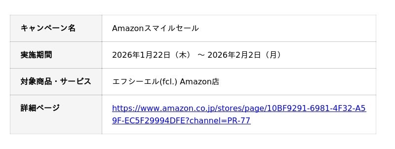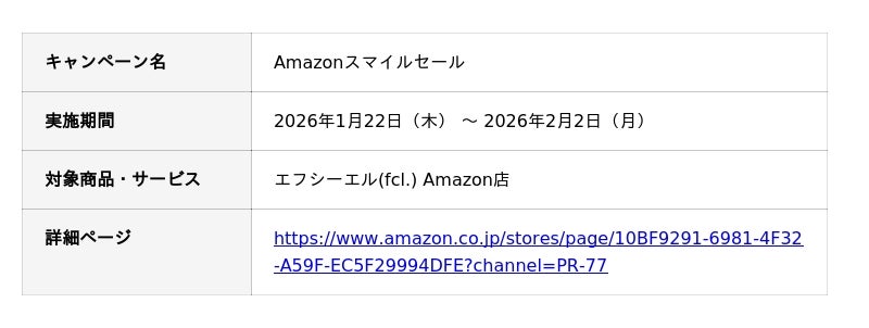 車・バイク用カスタムパーツ専門店エフシーエル(fcl.)を展開する株式会社WiNEEDS HOLDINGS(所在地:広島市南区、代表取締役社長:尾田 雅史)は、2026年1月22日(木)から2月2日(月)まで開催される「Amazonスマイルセール」に参加し、人気製品を最大50%OFFで販売いたします。