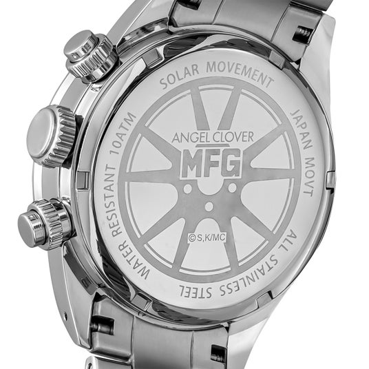 ケースバックはホイールをイメージしたデザイン。MFGとANGEL CLOVERロゴが刻印されています。