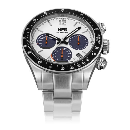 文字盤全体を気品あふれるホワイトカラーで満たし、同車種の圧倒的なパフォーマンスや高級感を表現。ブラックのハイコントラストを描くサブダイヤルは、ポルシェ・718ケイマンGTSの車載メーターをイメージしたもの。インジケーターに抜群の視認性を誇るオレンジを用いた点に、ストイックなまでに走りを求める姿勢がうかがえます。12時位置のインデックスは、彼のゼッケンナンバー「12」も現しています。