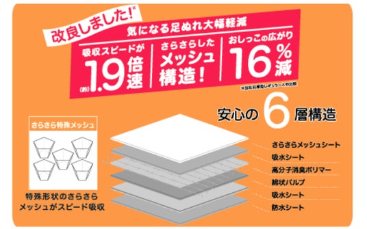 面ではなく点で吸収するメッシュ構造を採用しており、おしっこの広がりを従来品より16%(※4)抑え、床やシーツの汚れを減らし、トイレ周りを清潔に保ちやすくなっています。