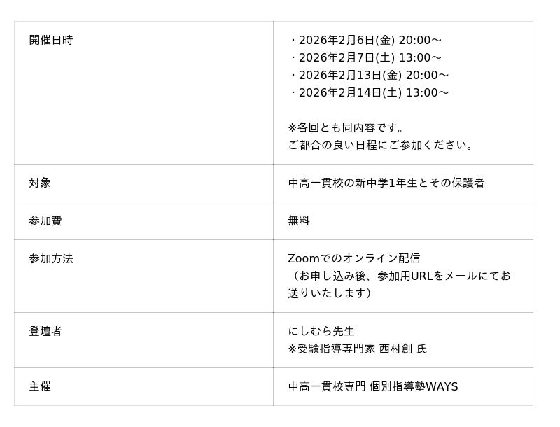 中高一貫校専門 個別指導塾WAYS(運営:株式会社メイツ、本社:東京都新宿区)は、受験指導専門家であり多数の著書を持つにしむら先生(西村創氏)をお招きし、2026年2月6日(金)より計4回にわたり、新中学1年生とその保護者を対象とした無料オンラインセミナー『中高一貫校入学前に整える「心・技・体」の準備』を開催いたします。 本セミナーでは、中学校合格だけをゴールとせず、入学後の学校生活で伸び続けるために不可欠な入学前の準備について、プロの視点から徹底解説します。