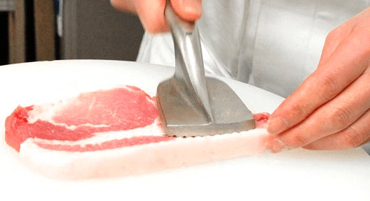 【まい泉】筋を引き、一枚一枚肉の繊維をほぐします。1本の筋の切り損ないが、揚げた時に肉の形を崩すので手間の掛かる作業ですが、手抜きはできません