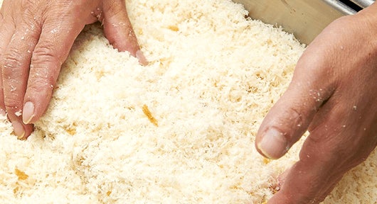 【まい泉】美味しい豚肉をやさしく上品に包み込む衣。歴代の職人たちが研鑽を重ねてきた技術を継承していくために、まい泉ではパン粉付けの社内認定制度を導入しております