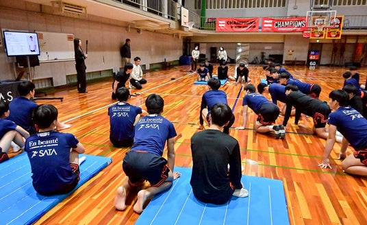 そして、接触プレーや転倒を想定し回転感覚と空中感覚を養うため、体操由来の「正しいころび方(受け身の取り方)」を伝授。