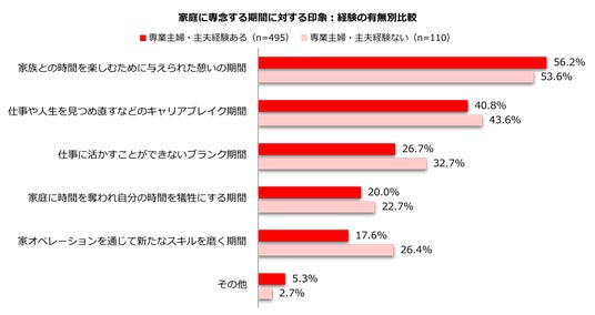 また、「職業キャリアを考えた時、仕事から離れて家庭に専念する期間に対する印象として当てはまるものをお教えください」との質問では、「家族との時間を楽しむために与えられた憩いの期間」のみプラス。マイナスでギャップ最大だったのは「家オペレーションを通じて新たなスキルを磨く期間」の-8.8pts。専業主婦・主夫を経験すると家族と過ごす時間の大切さをより感じる一方、家オペに費やす時間についてはネガティブに捉えてしまう傾向が伺えます。仕事も家オペも生活に不可欠で大切な役割ですが、家オペについては過小評価されがちのようです。家オペ力(※1)を通じて仕事に活かせるソフトスキルも磨かれていることやイエチカ(※2)を評価することの意義に、もっと社会から目が向けられればと願います。