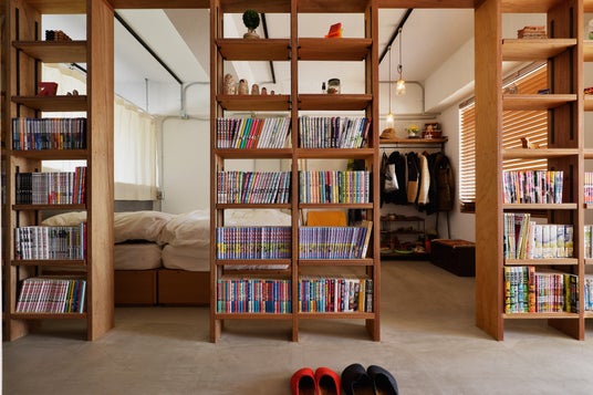 造作の本棚が、将来的に間仕切りや出入り口として機能する事例