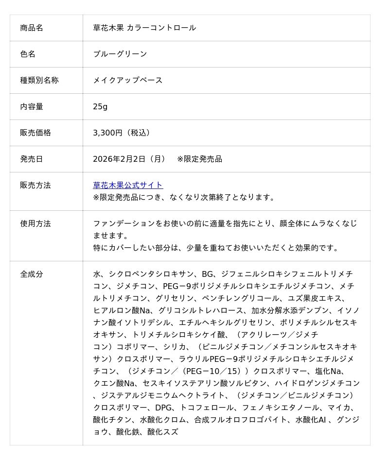 株式会社キナリ(本社:東京都品川区、取締役社長:山本 理史)が展開する自然派化粧品ブランド『草花木果(そうかもっか)』は、2026年2月2日(月)より<草花木果 カラーコントロール(ブルーグリーン)>を限定発売いたします。