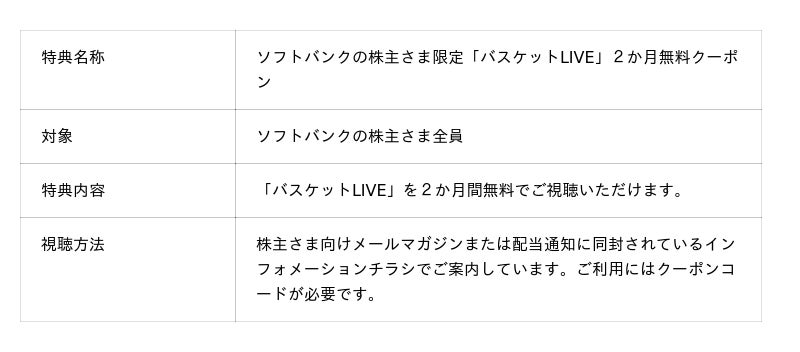 ソフトバンク株式会社(証券コード9434、以下「ソフトバンク」)は、個人投資家の皆さまにソフトバンクの企業活動をより身近に感じていただけるよう、さまざまな取り組みを行なっています。今回は株主さま全員を対象に、バスケットボール配信プラットフォーム「バスケットLIVE」(月額550円)を2か月無料で視聴できる特典を提供します。