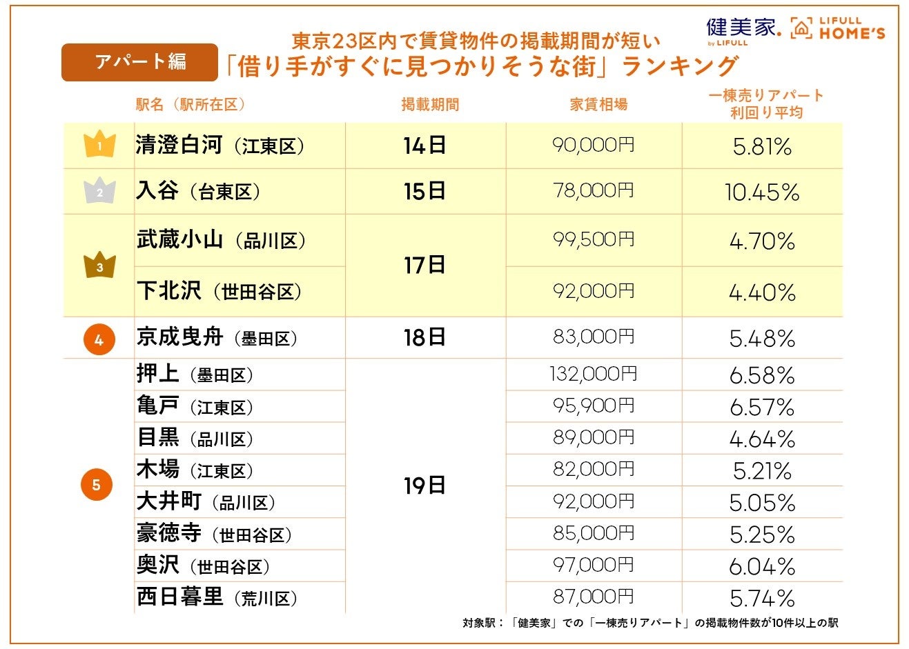 事業を通して社会課題解決に取り組む株式会社LIFULLのグループ会社であり、不動産投資と収益物件の情報サイト「健美家(以下、健美家)」および「LIFULL HOME'S 不動産投資」を運営する健美家株式会社(代表取締役社長:成瀬 亮輔)は、株式会社LIFULLが運営する不動産・住宅情報サービス「LIFULL HOME'S」のデータを活用し、賃貸物件の掲載期間をもとに東京23区内の賃貸マンション・アパートの借り手がすぐに見つかりそうな街ランキングを発表しました。