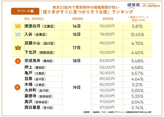 アパート編:1位は「清澄白河」で掲載期間は14日 城東・城南エリアが上位に