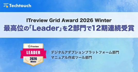 テックタッチ株式会社が提供・開発する、AI型デジタルアダプションプラットフォーム(DAP)国内シェア5年連続No.1の「テックタッチ」が、IT製品レビュープラットフォーム「ITreview」で発表された「ITreview Grid Award 2026 Winter」において、最高位である「Leader」を3部門で受賞したことをお知らせします。「デジタルアダプションプラットフォーム部門」と「マニュアル作成ツール部門」の2部門は、12期連続での受賞となります。