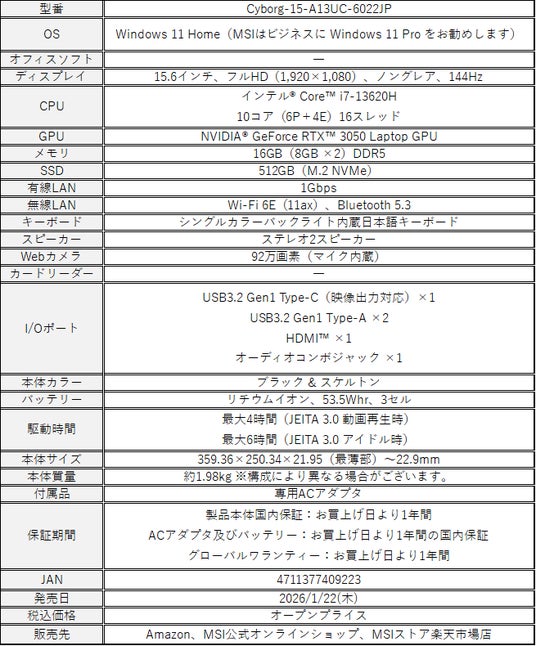 この度、エムエスアイコンピュータージャパン株式会社は、未来感あふれるサイバーパンクデザインと高性能を融合したゲーミングノートPC「Cyborg 15」シリーズより、「Cyborg-15-A13UC-6022JP」を本日2026年1月22日(木)より順次販売開始いたします。