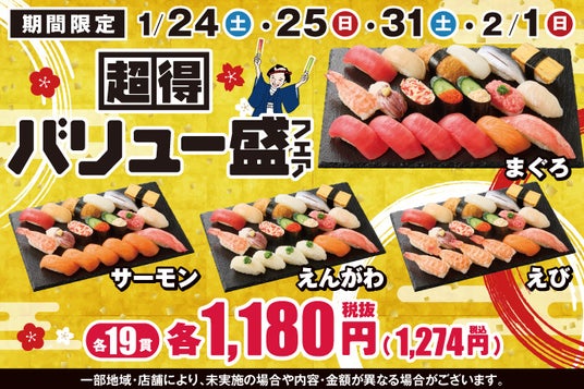 KOZOホールディングス株式会社の子会社である株式会社小僧寿しは、持ち帰りすし店「小僧寿し」にて、1月24日(土)~25日(日)、1月31日(土)~2月1日(日)の期間限定で『超得バリュー盛フェア』を開催します。(※店舗により未実施の場合がございます)