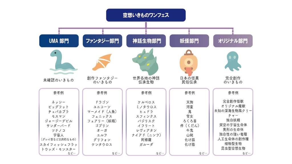 オリジナル作品を制作している方を対象に、未知なる生命への想像を形にする造形企画『空想いきものワンフェス』を実施します。「UMA部門」・「ファンタジー部門」・「神話生物部門」・「妖怪部門」・「オリジナル部門」の5部門に分け、実在しない“いきもの”をテーマにした作品を募集し、特設ブースにて展示いたします。