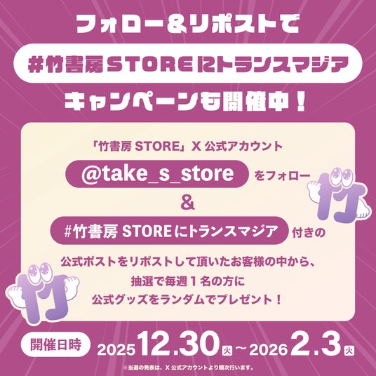 2026年2月3日(火)までの期間に「竹書房STORE」X公式アカウント @take_s_store をフォロー& 「#竹書房STOREにトランスマジア」付きの公式ポストをリポストして頂いたお客様の中から、抽選で公式グッズをランダムでプレゼント!