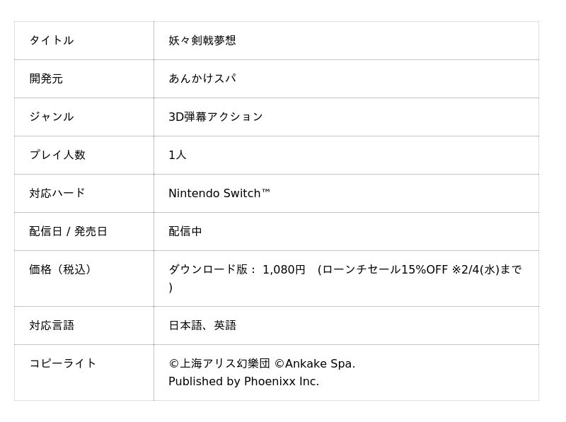 株式会社Phoenixx(フィーニックス)(東京都武蔵野市、代表取締役社長:坂本 和則)は、東方Projectファンゲームである3D弾幕アクション『妖々剣戟夢想』をNintendo Switch(TM)向けに、本日1月22日(木)より配信開始しましたことをお知らせいたします。