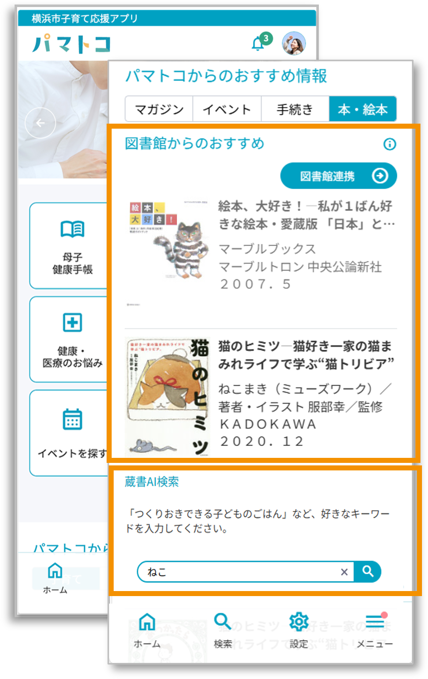 これまで掲載していた情報に加えて、パマトコに登録されたお子さまの年齢に応じたおすすめの本・絵本が表示されます!お気に入りの本が見つかったら、そこから貸出予約も可能です。