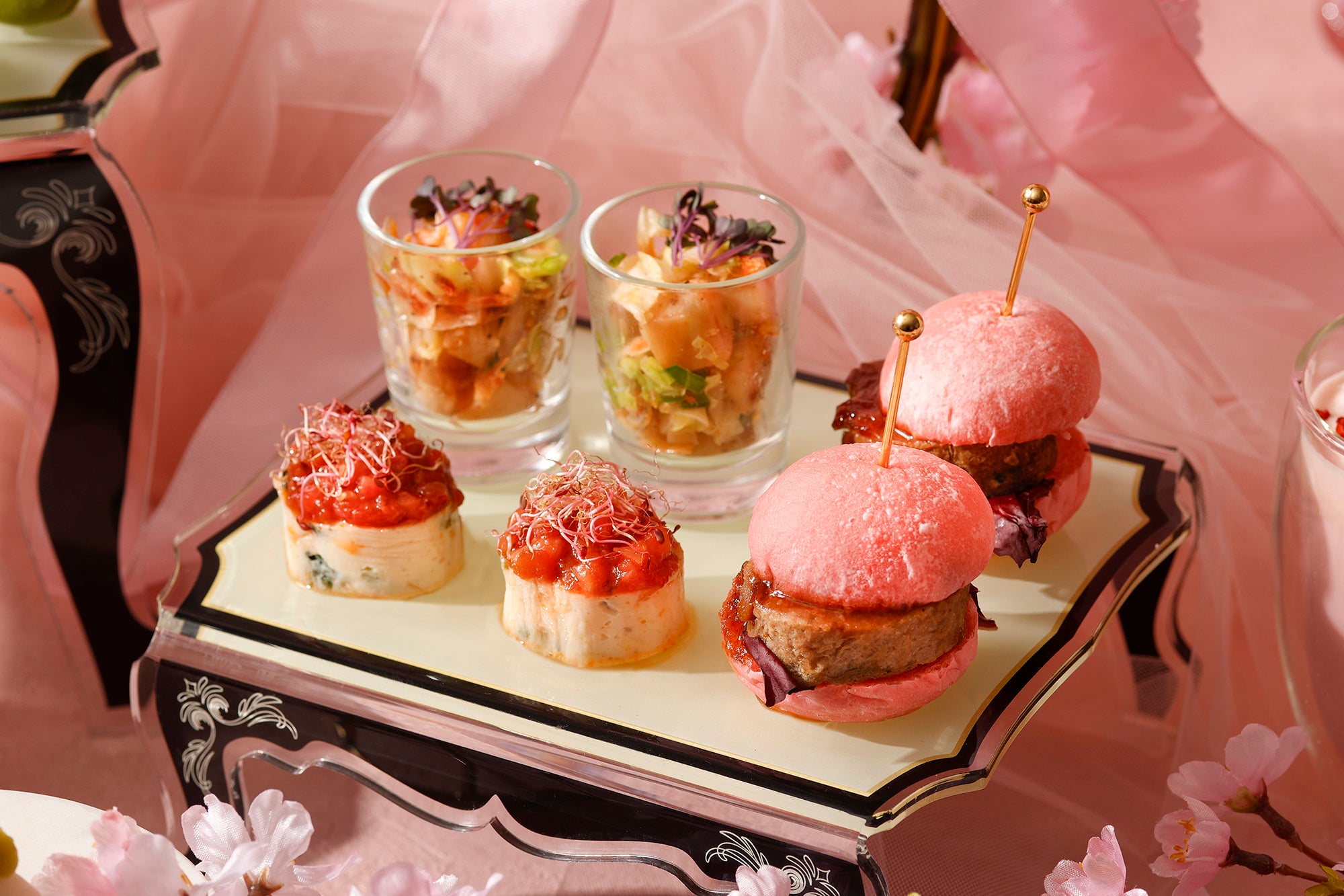 スイーツは、いちごやベリーのフレッシュな味わいを楽しめるタルトやエクレア、桜の飾りをあしらった桃色のムースやオペラ、小さなフォルムが可愛らしい2色の団子など、お花見気分を高める華やかな7種類がスタンドを彩ります。
