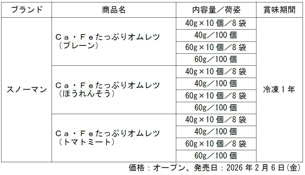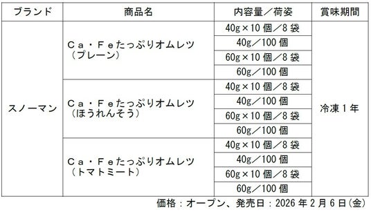 キユーピー株式会社(本社:東京都渋谷区、代表取締役 社長執行役員:高宮 満、以下キユーピー)は、業務用商品「スノーマン Caたっぷりオムレツ」シリーズ(冷凍品)を全面リニューアルし、新たに鉄分を配合して見た目も向上させた「Ca・Fe(カルシウム・鉄)たっぷりオムレツ」シリーズとして発売します。