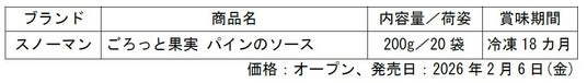 キユーピー株式会社(本社:東京都渋谷区、代表取締役 社長執行役員:高宮 満、以下キユーピー)は、業務用商品「スノーマン ごろっと果実 パインのソース」を新発売します。ごろっとしたパインの果肉感と、フレッシュ感のある濃厚な味わいが特徴で、夏の需要期に向けてデザートメニューの付加価値向上に貢献できる商品です。