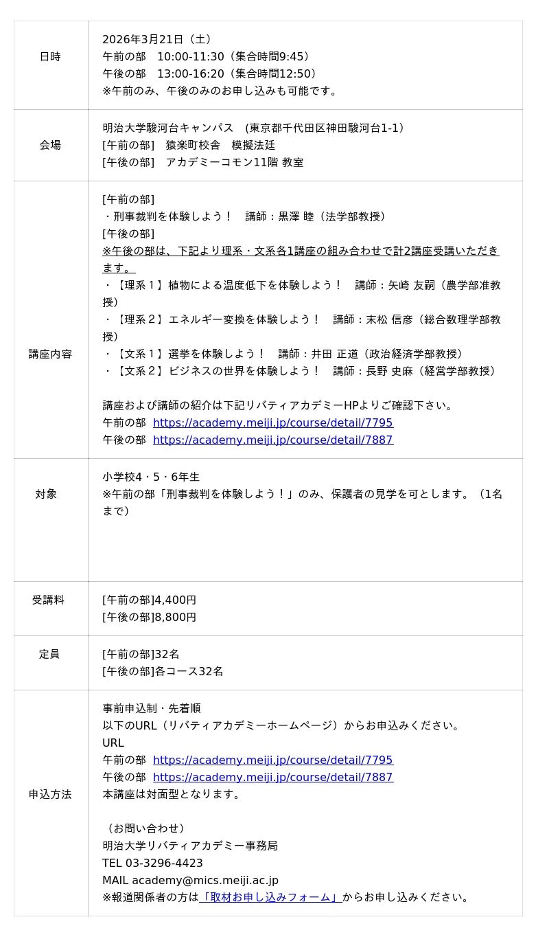 明治大学の生涯学習機関「明治大学リバティアカデミー」は、3月21日(土)に小学校4・5・6年生を対象とした体験型講座「明治大学ONE DAYアカデミー」を駿河台キャンパスで開催します。