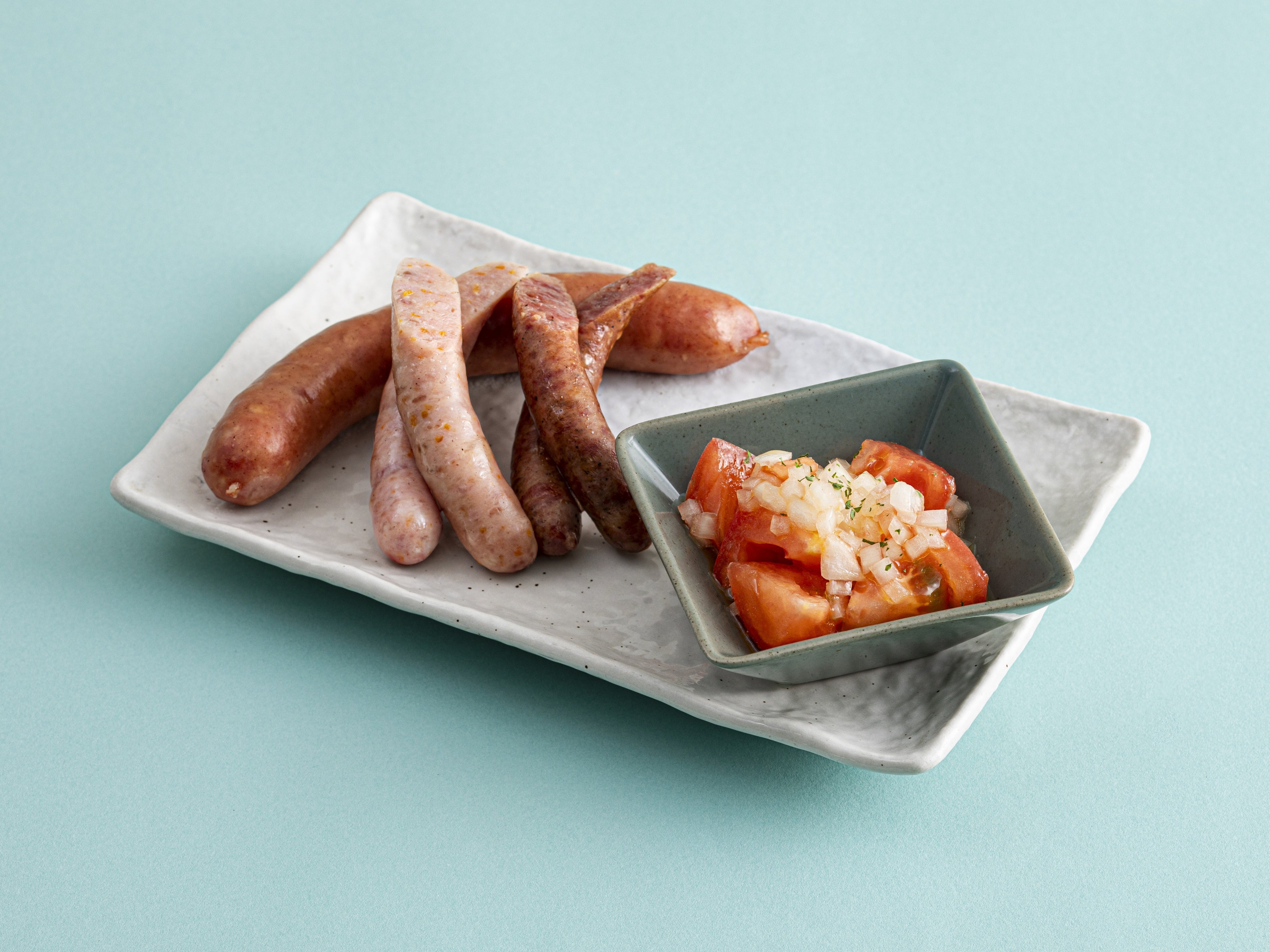 牛たんソーセージ3種とトマトオリーブオイルサラダ 990円/牛たん炭焼 利久牛たんを使用した利久こだわりの牛たんソーセージ3種(プレーン・ゆず・チーズ)と、藤沢産トマトのオリーブオイルサラダを盛り合わせた一皿。濃厚な牛たんの旨みを生かしたソーセージは、それぞれ異なる風味が楽しめます。ジューシーで甘みのあるトマトが、味わいにさっぱりとしたアクセントを添える、食べ応えと爽やかさを兼ね備えたバランスの良いメニューです。