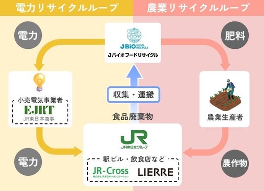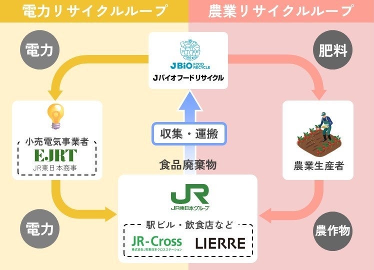 JR東日本グループでは、駅ビルやエキナカ商業施設などから出る食品廃棄物を、「電力」と「農業」でリサイクルする取り組み『ダブルリサイクルループ』を推進しています。これまで廃棄されていた食品を資源として捉え直し、暮らしの中で循環させていく仕組みです。