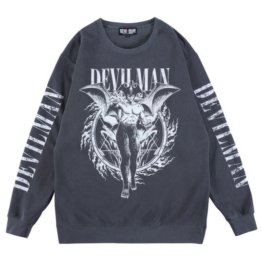 デビルマンが大きくプリントされたクルーネックスウェットが登場!もはやルネサンス期の宗教画を思わせるような、静謐な筆致で描かれたゴシックなデザインは、シンプルでありながら荘厳な迫力を感じさせるド渋い逸品!もはや着るアート作品だ!