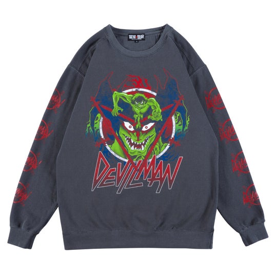 不動明とデビルマンが描かれた印象的なクルーネックスウェットが登場!退廃的かつハードコアなデザインがビビッドな配色でプリントされたデザインは、まさに漫画『デビルマン』が描いた破壊的衝動を体現!身も心も熱くさせる、熱狂的ファンこそ着たい1枚!