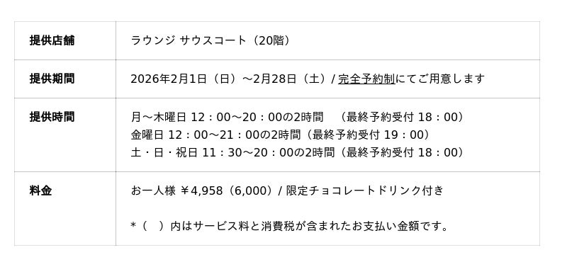 「小田急ホテルセンチュリーサザンタワー」(所在地:東京都渋谷区代々木2-2-1、総支配人:宮越 真理子)内、「ラウンジ サウスコート」では、「バレンタインアフタヌーンティー」を2026年2月1日(日)から2月28日(土)までの期間限定、完全予約制にてで提供いたします。