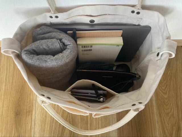 A4サイズが必須な筆者はアイボリーのMサイズを購入。シンプルなキャンバス地のトートバッグでマチがしっかりあり、荷物を入れなくても自立するのが特徴です◎