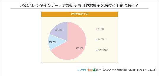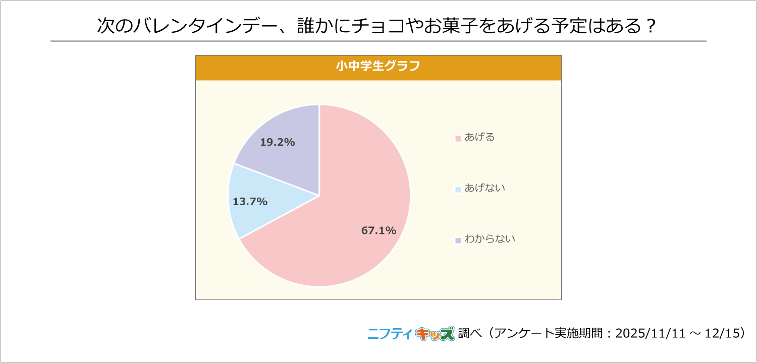 67.1%の小中学生が、次のバレンタインデーに誰かにチョコやお菓子を「あげる」と回答しました。「バレンタインデー」という行事を重視している人が多いことがうかがえます。