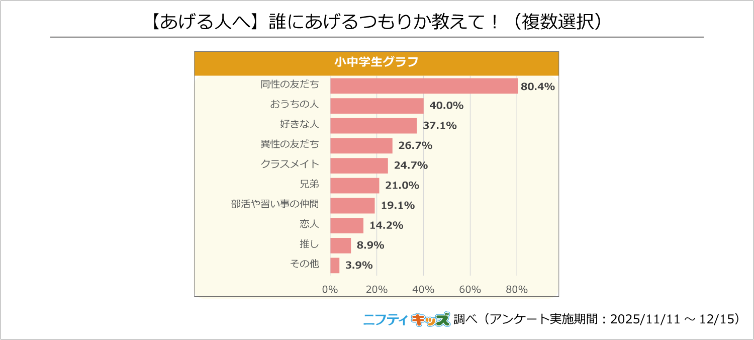 最も多かった回答は「同性の友だち」で、小中学生の約8割を占めました。一方、「好きな人」にあげると回答した人は37.1%で、友だち同士で「友チョコ」を交換する習慣が広がっていることがわかります。