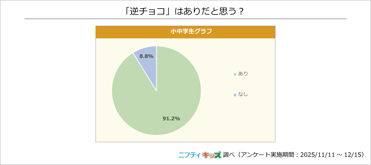 約9割の小中学生が、逆チョコは「あり」と考えていることがわかりました。「本命チョコ」「義理チョコ」「友チョコ」「自分チョコ」など、バレンタインデーのチョコの種類は多様化しており、「逆チョコ」もバレンタインチョコの1種として違和感なく受け入れられている様子がうかがえます。