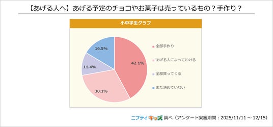 小中学生の42.1%が「全部手作り」と回答しました。次いで多かったのは「あげる人によって手作りか購入かをわける」という回答です。「全部購入する」と回答した人は11.4%と少数派でした。