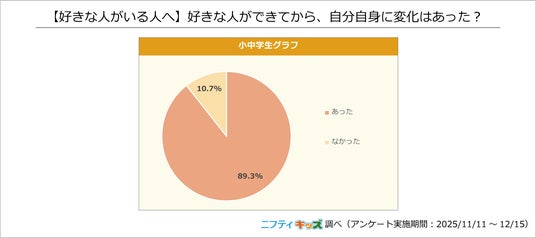 好きな人がいる小中学生の約9割が、好きな人ができたことによる自分自身の変化を自覚していると回答しました。