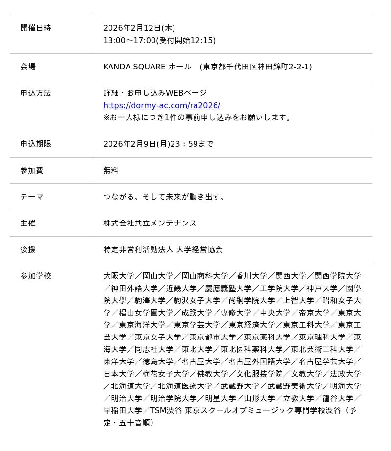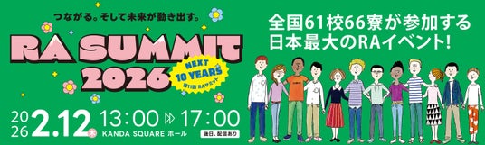 全国で約1,300校の学校法人と提携し、学生寮を展開する株式会社共立メンテナンス(以下、共立メンテナンス/代表取締役社長:中村 幸治/本社:東京都千代田区)は、ドーミーシリーズに暮らす全国61校66寮の現役RA(レジデント・アシスタント)が理想の寮の実現に向けて日々取り組んでいる活動について発表を行う「第11回 RA SUMMIT2026」を、2026年2月12日(木)に開催いたします。