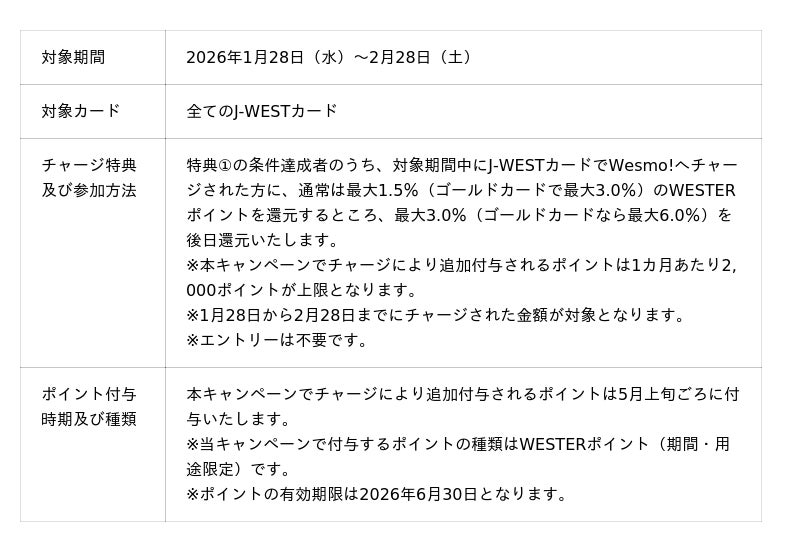 2月28日までの期間、J-WESTカードからWesmo!へチャージするといつもの2倍の WESTERポイントが還元されるキャンペーンを開催中!!