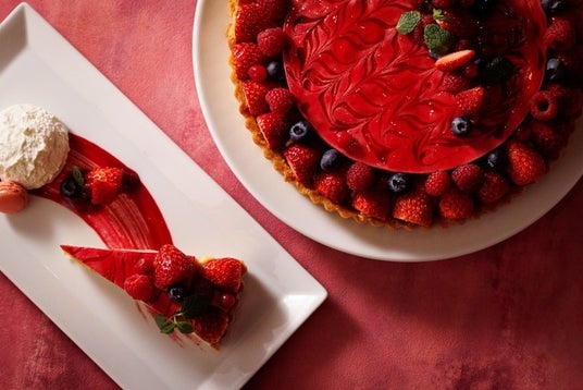 完熟した苺とラズベリーを惜しみなく敷き詰めたベリータルト。果実のフレッシュな酸味・芳醇な甘みがバターの香るタルト生地と調和。口いっぱいに春らしい彩りが広がる。