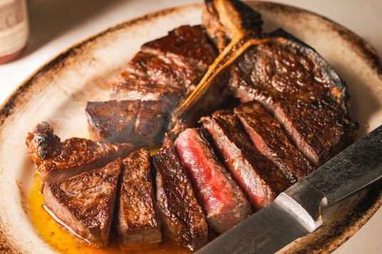アメリカから輸入したUSDA(アメリカ合衆国農務省)認定 プライムビーフを店内の専用熟成庫で管理。最低4週間しっかりと熟成。お肉の旨味を最大限まで高め、仕上げには専用のブロイラーでお皿ごと高温にて調理。熱々のままテーブルへお届け。ご家庭では味わえない一皿を心ゆくまでお楽しみいただけます。(写真はTボーンステーキ)