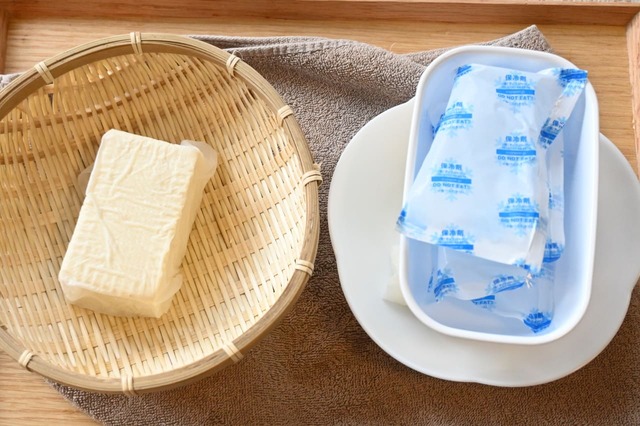 豆腐を平らな皿などにのせ、上からもう一枚の皿や鍋を重しとして置きます。時間は約20~30分ほど。ゆっくりと均一に水分が抜けるため、味が染み込みやすくなるのが特徴です。