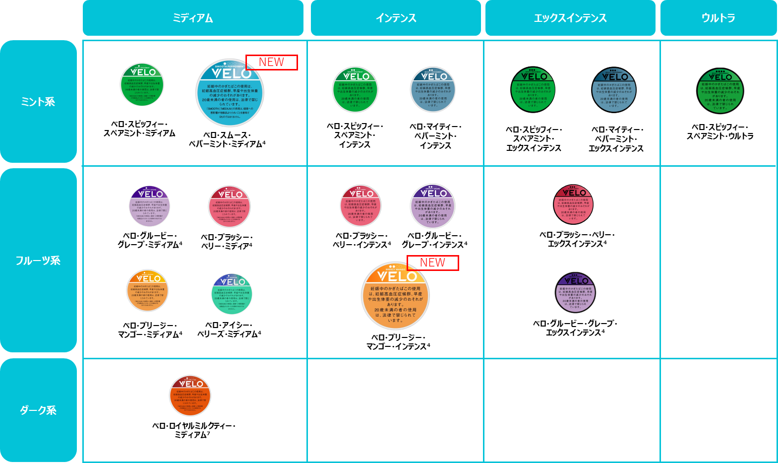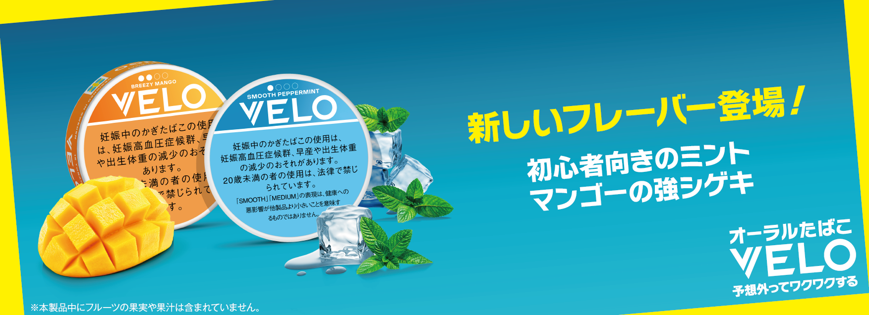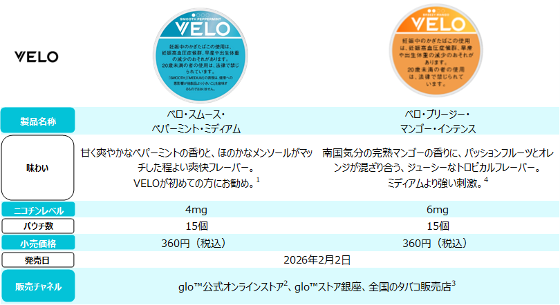 BAT ジャパン(正式名称:ブリティッシュ・アメリカン・タバコ・ジャパン合同会社、本社:東京都港区、社長:マウリシオ・ララ)は、いつでもどこでも楽しめる、オーラルたばこ「VELO(ベロ)」から、新たに「ベロ・スムース・ペパーミント・ミディアム」および「ベロ・ブリージー・マンゴー・インテンス」の2銘柄を、2026年2月2日(月)よりglo(TM) & VELOオフィシャルオンラインショップ[2]、glo(TM) ストア 銀座、全国のたばこ販売店[3]にて順次発売します。