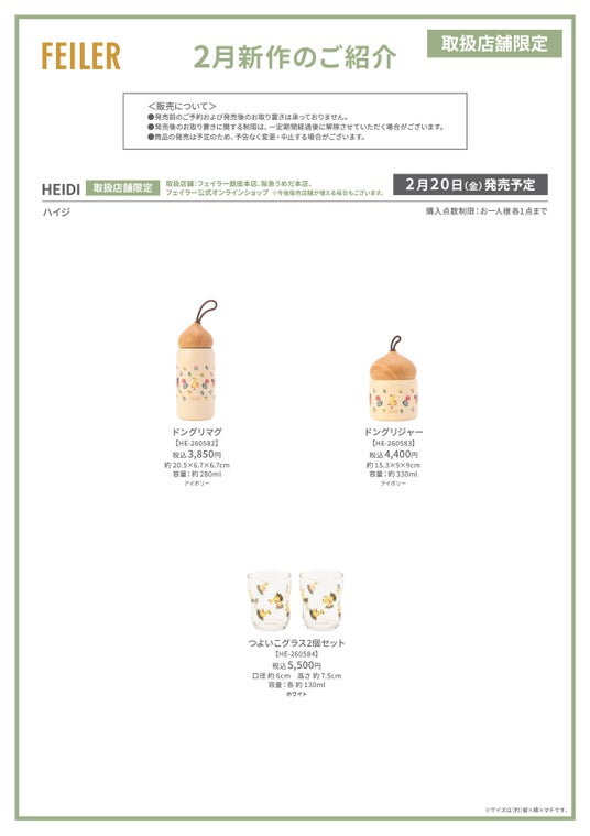 オープン日の2月13日(金)からは、てんとう虫にちょうちょ、小鳥たち、そして小さな花・・・ドイツの野にいる小さな生き物たちが追いかけっこをしている様子をイメージしたフェイラーの人気デザイン『ハイジ』のベビーアイテムをラインアップ。
