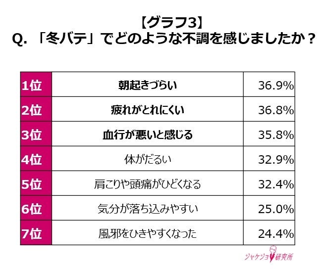 可能性があります(グラフ3)。“冬バテ”対策は、働く女性のパフォーマンスを維持する上での大事なポイントと言えそうです。